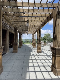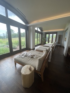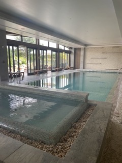 After lunch, we toured the fitness room, spa, and pool/hot tub. The fitness room is equipped with a Peloton bike and a Tonal and the treadmills have views of the Blue Ridge mountains. The spa was dreamy (more on that later) and the pool left little to be desired – we knew we had to make time for swimming/soaking!